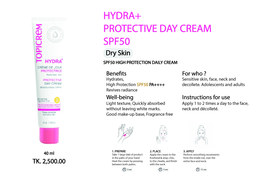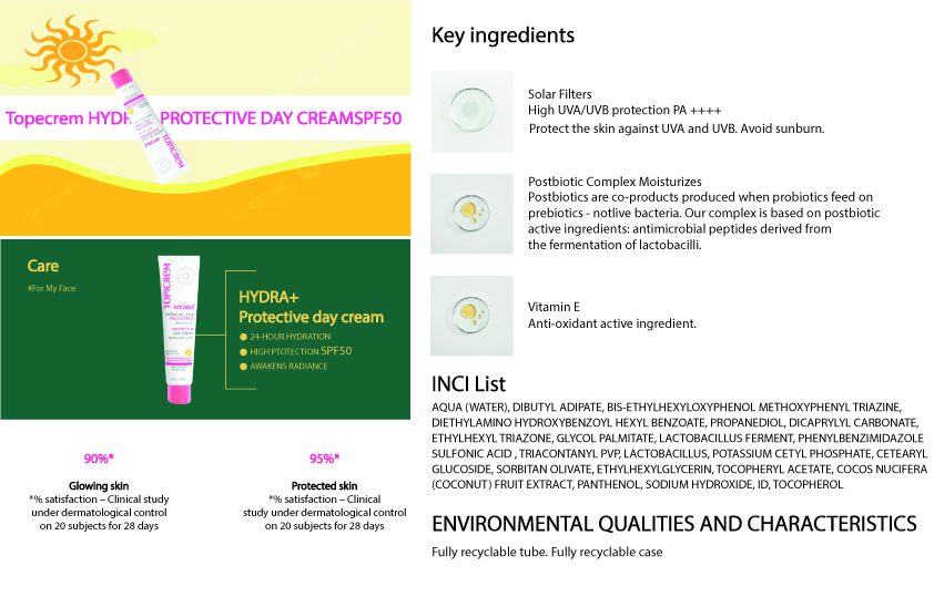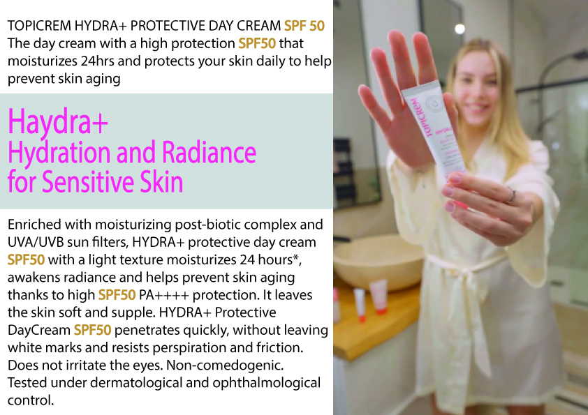 TOPICREM HYDRA+ PROTECTIVE DAY CREAM SPF 50, the day cream with a high protection SPF50 that moisturizes 24hrs and protects your skin daily to help prevent skin aging.