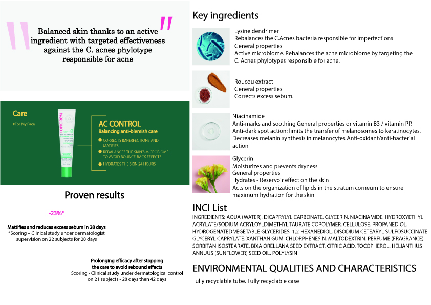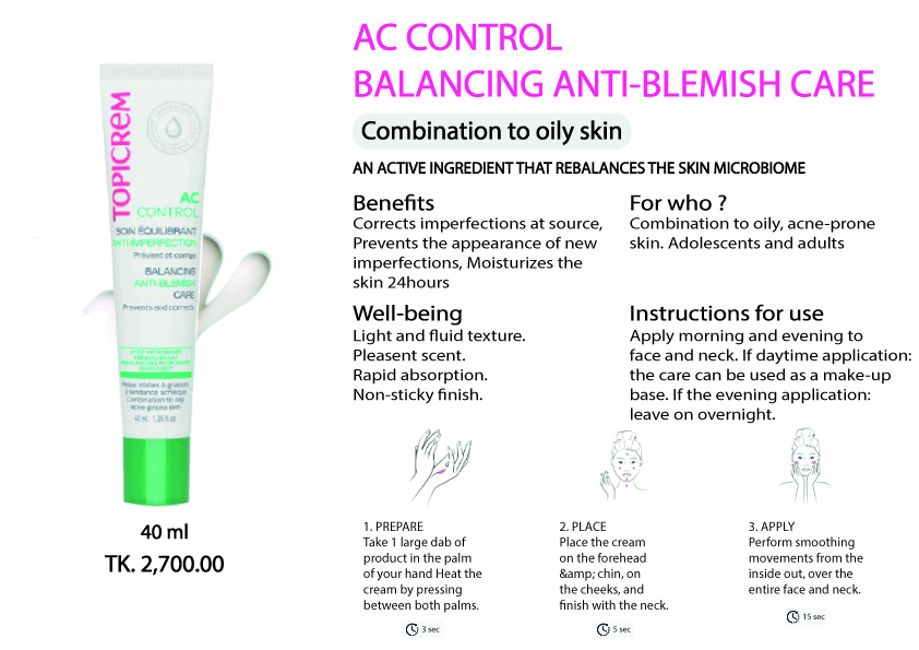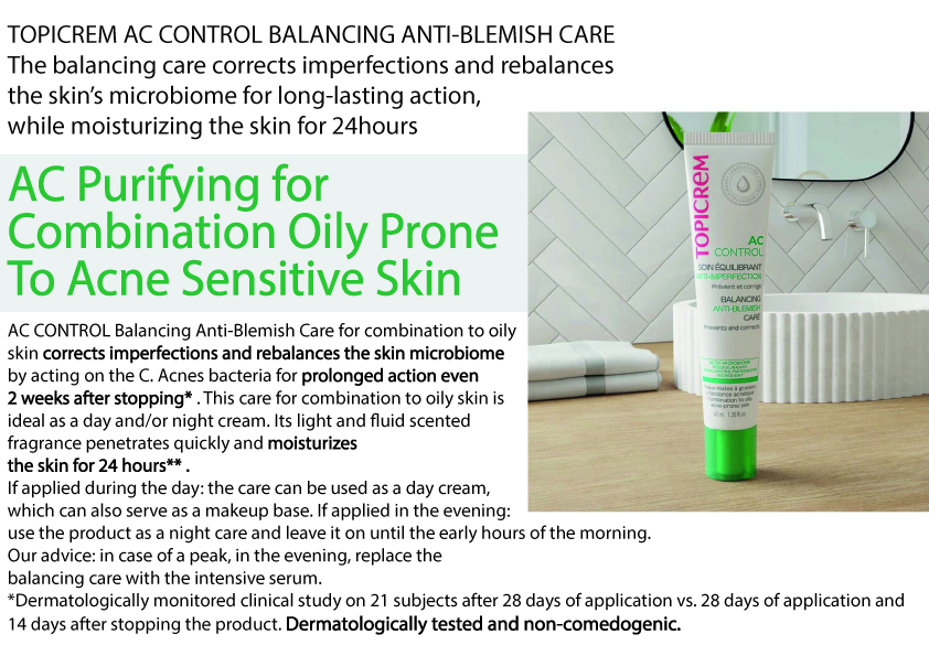 TOPICREM AC CONTROL BALANCING ANTI-BLEMISH CARE,the balancing care corrects imperfections and rebalances the skin’s microbiome for long-lasting action,