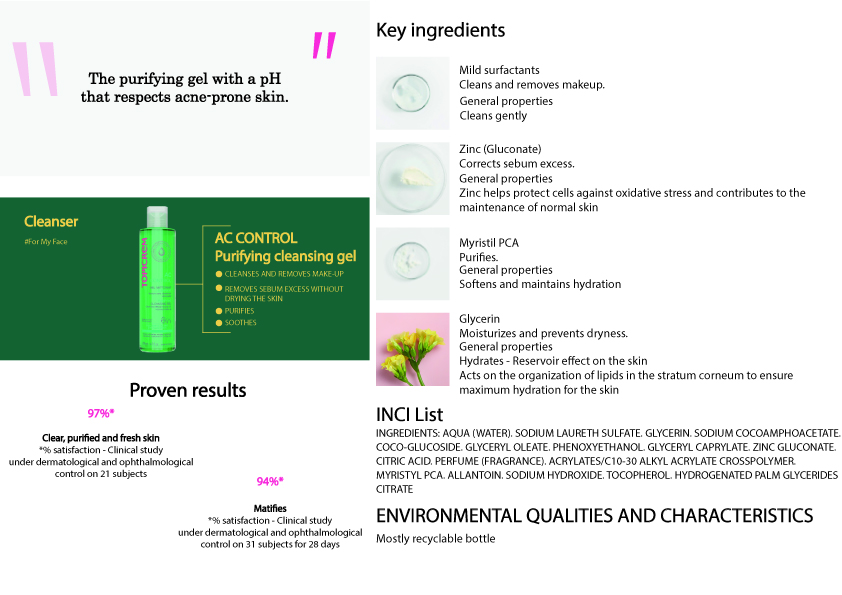 Gently cleanses, Purifies and eliminates impurities, Removes make-up, Hypoallergenic, Sensitive and oily skin.