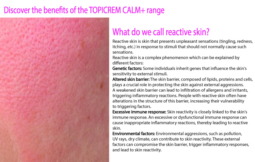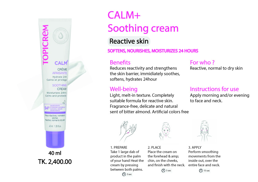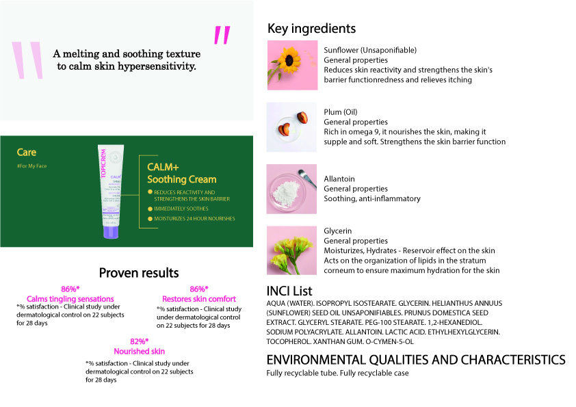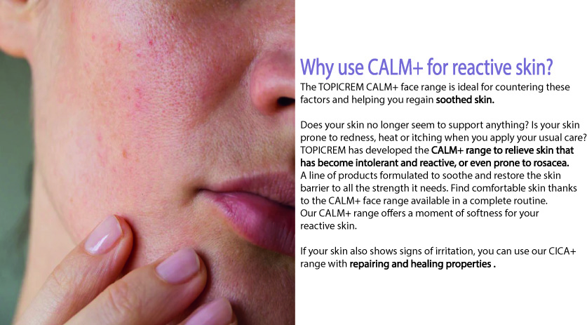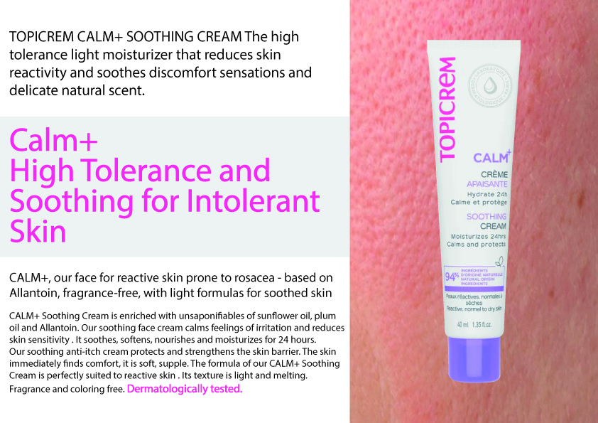 TOPICREM CALM+ SOOTHING CREAM The high tolerance light moisturizer that reduces skin reactivity and soothes discomfort sensations and delicate natural scent.