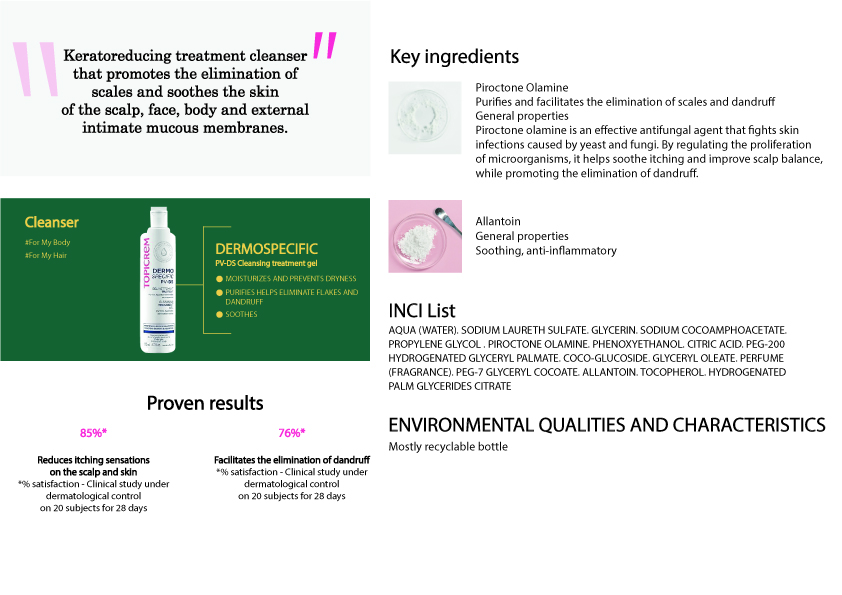 Flaky skin, Dandruff scalp, Pityriasis versicolor, Suitable for the hygiene of external intimate mucous membranes of adults prone to mycosis, Dermatophytosis,Candidiasis, Seborrheic dermatitis, Dry Dandruff, Oily Dandruff.